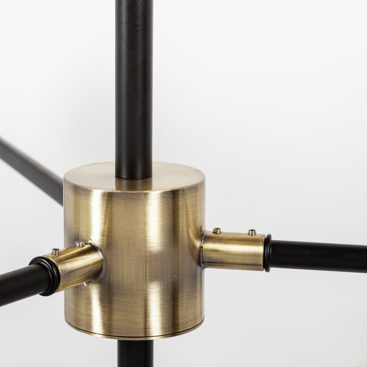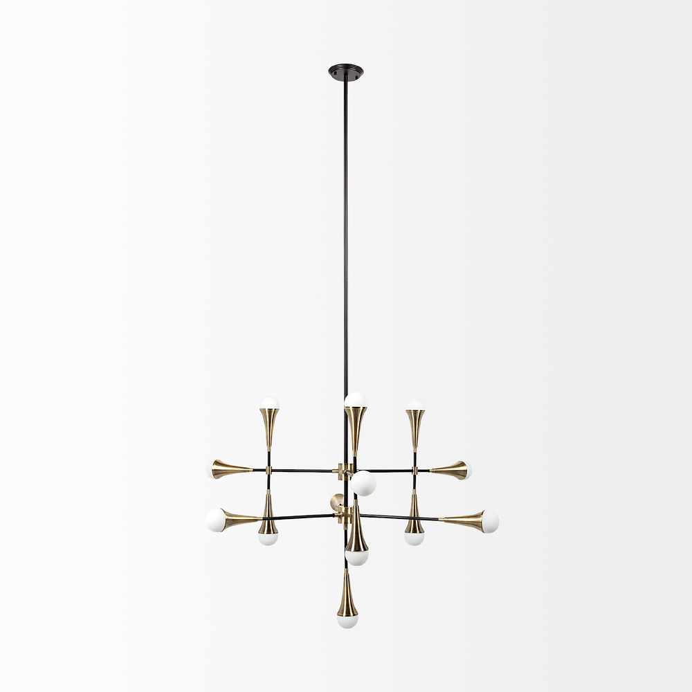 Decarlo Black/Gold Metal Multi-Arm Thirteen Light Chandelier crafted from metal, the Decarlo II is an extravagant chandelier based on a multi-arm, sputnik-inspired design that flaunts a matte-black toned chassis equipped with thirteen glass globe lights with antiqued-champagne accents.