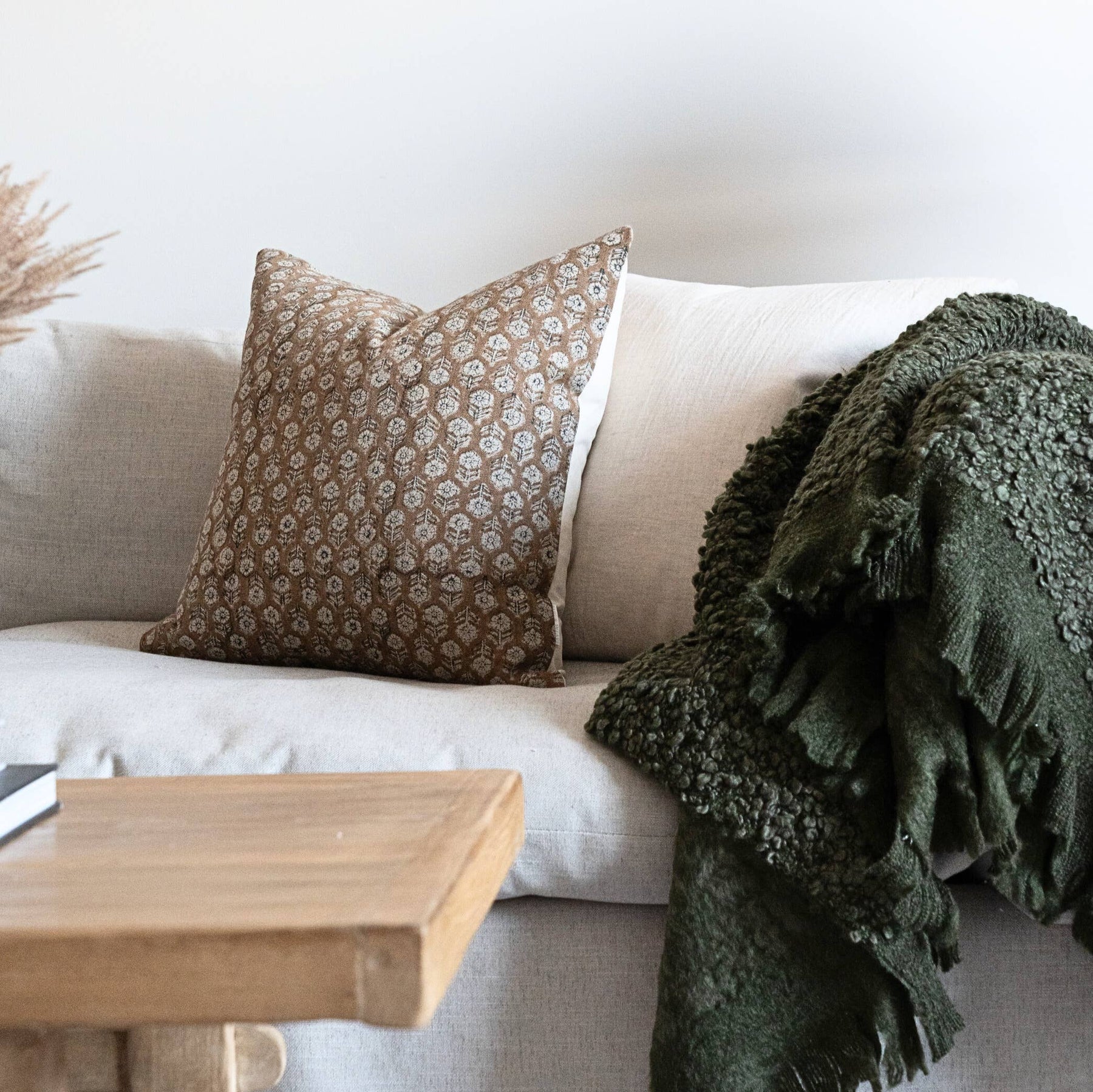 Introducing BETSY - a new botanical block print, featuring a small floral motif on linen with a rustic quality and texture. This simple and timeless motif stands out in any space adding cottage core charm and hand made artistry all at once. Hand block printed in India, this textile is truly unique and representative of hundreds of years of tradition and skill. Designed and made by Rug & Weave, in Canada.