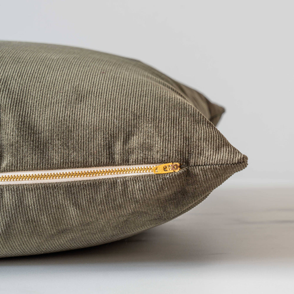 Classic corduroy in a deep olive green make this pillow the perfect textural addition for any living space. Adding both colour and texture, styling this pillow is a breeze when mixed with other prints and patterns. Double sided for that perfect wrap around texture. Front & Back: 100% Cotton Corduroy 14W Lining: 100% Cotton Brass YKK Zipper