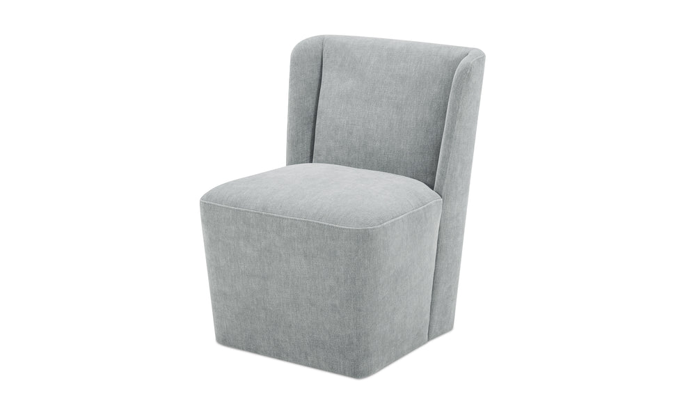 The Cormac rolling dining chair is all about comfort with a generously padded seat and backrest, a slight curve of the back and caster wheels that effortlessly glide across the floor. Crafted from high-performance fabric that is soft to the touch yet resilient against stains, spills, and daily wear.