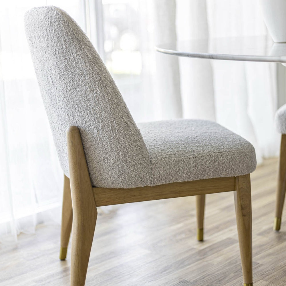 Sitting on top of slender salted oak wooden legs, the comfortable wide padded seat and back are upholstered in a durable taupe boucle fabric. Fawcett is ideal for creating comfy dining spaces or as an extra chair in bedrooms, offices, and entryways.