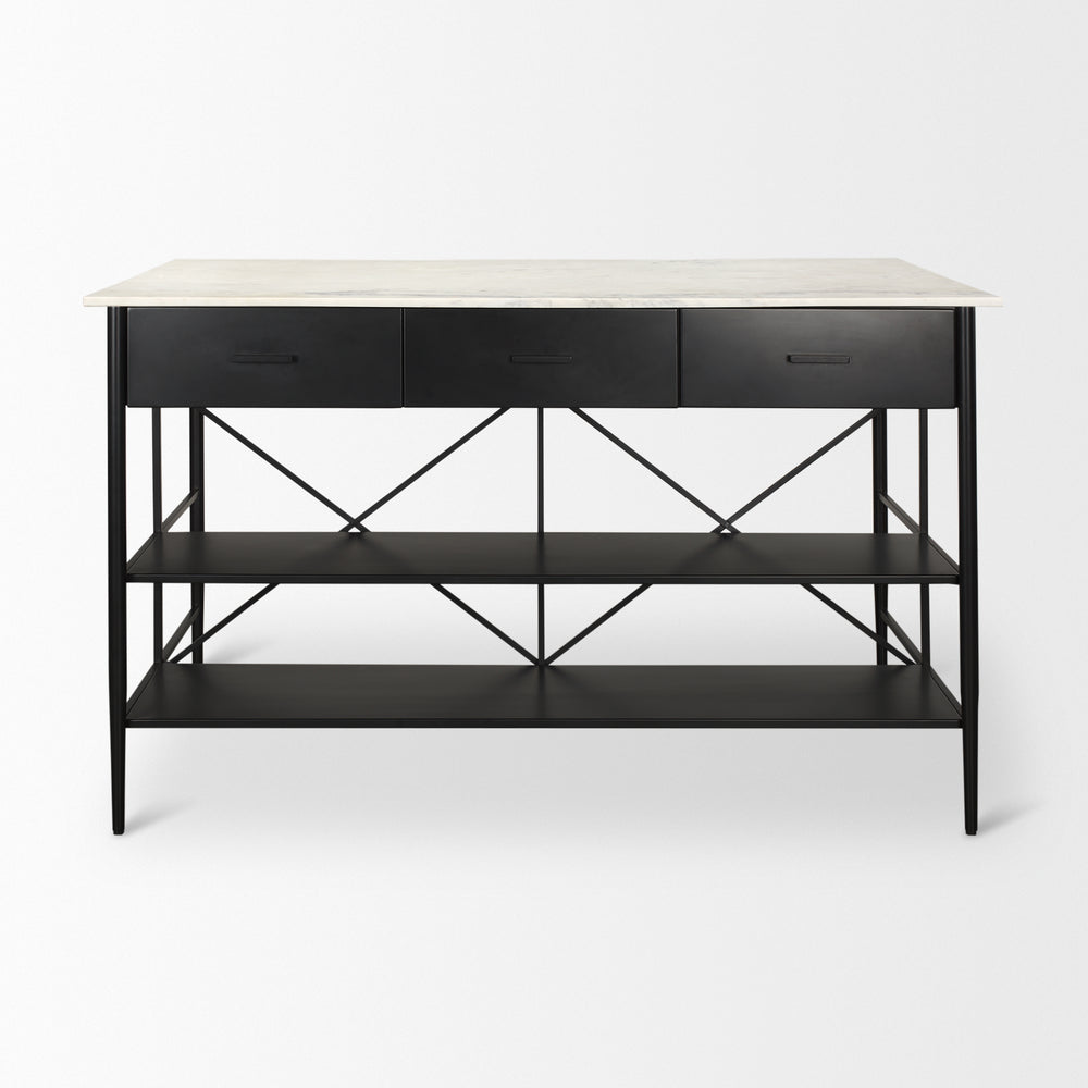 The Amika Kitchen Island features a luxurious, smooth white banswara marble top with gray veining set on top of a sturdy, matte black iron frame with three drawers and open shelves below. The three drawers are perfect for concealing knives, utensils or even spices while the two shelves serve as both a storage solution and display for cookware. The open space at the back allow for bar/counter stools to tuck under to create a casual dining area.