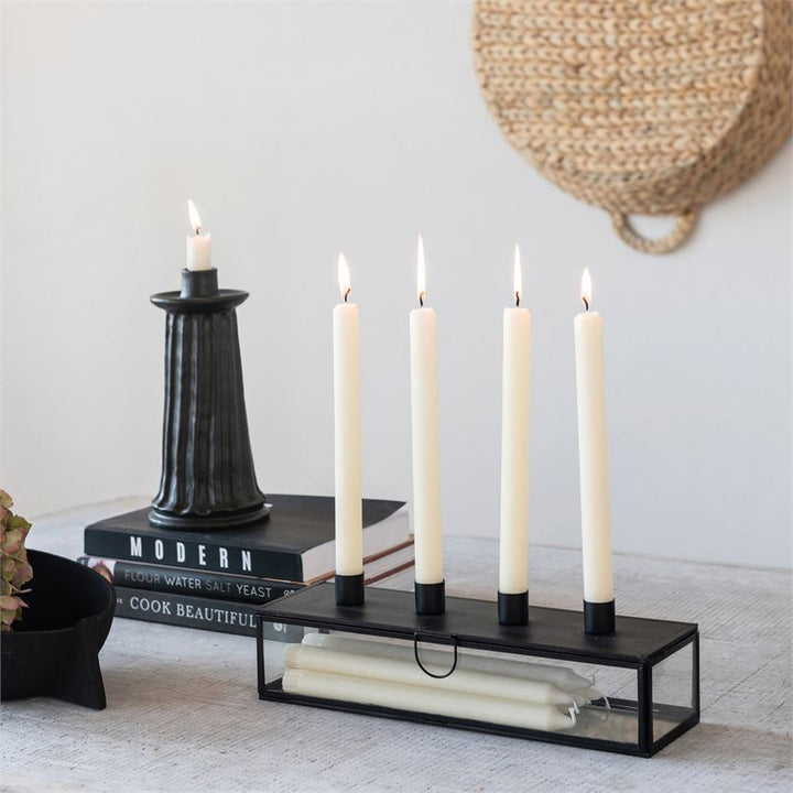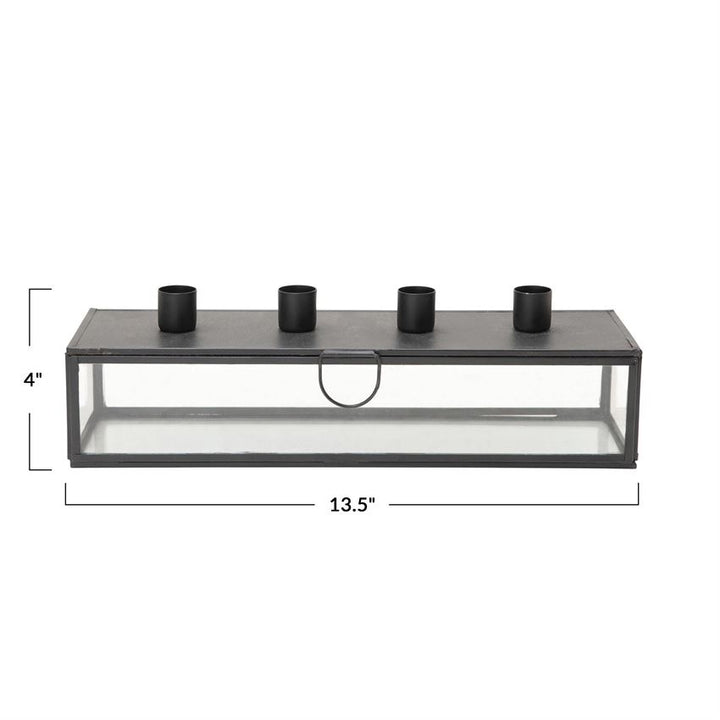 Intriguing and elegant metal and glass display case with a lid that holds up to 4 taper candles. Safely display treasured mementos, unique items or more candles. Matte black finish 13.5"L x 4"W x 4"H