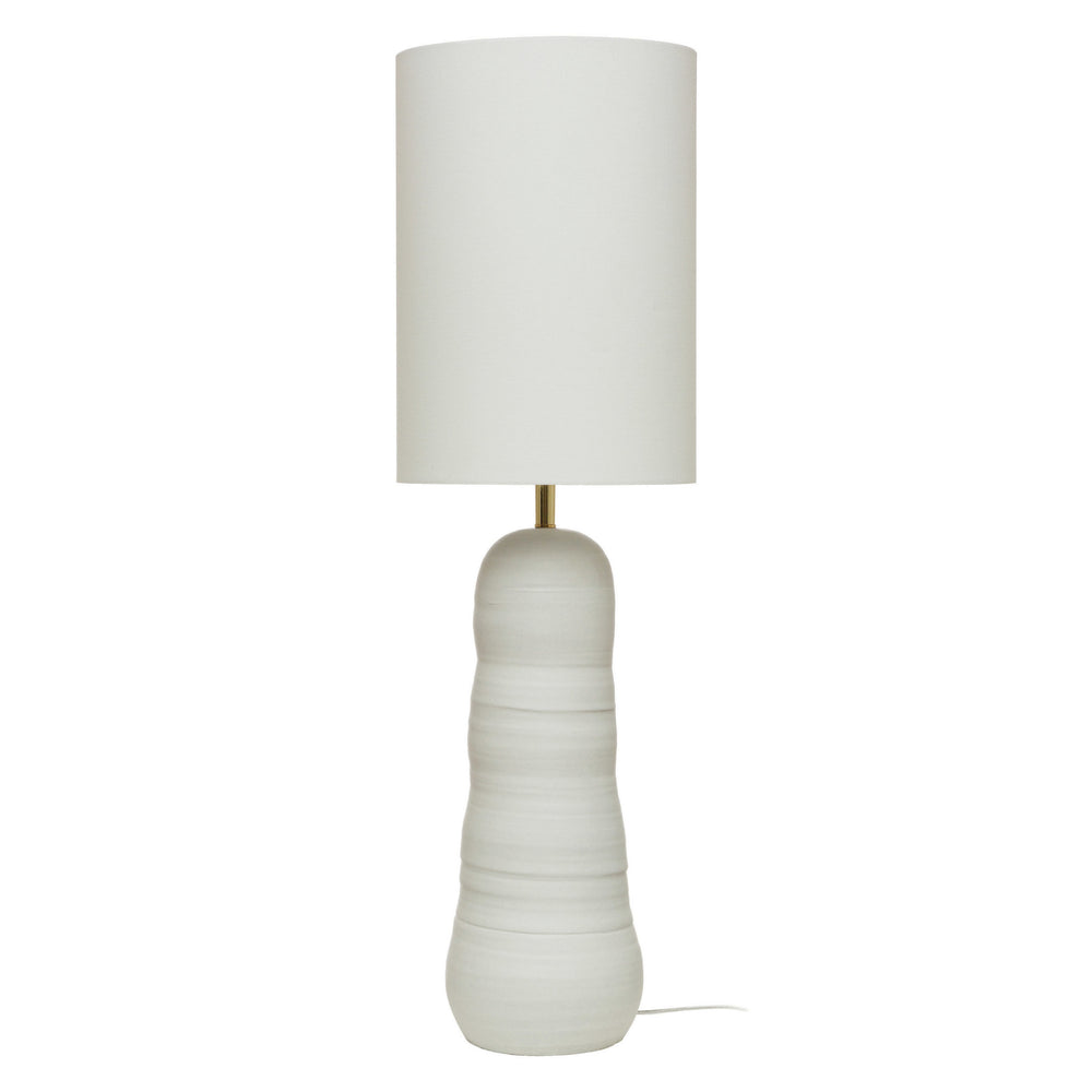 This stoneware floor or table lamp has a soft white reactive glaze finish and a tall white linen shade. It adds a bright and clean touch to nightstands, entry tables, console tables, or side tables. It works flawlessly with many styles, so the possibilities are endless.