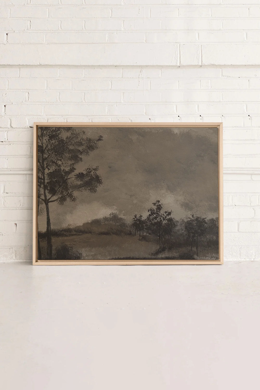 Enhance your walls with Hazy Woods. This high-quality print on stretched canvas is framed in sleek black, elevating any room with its subtle and stylish look.